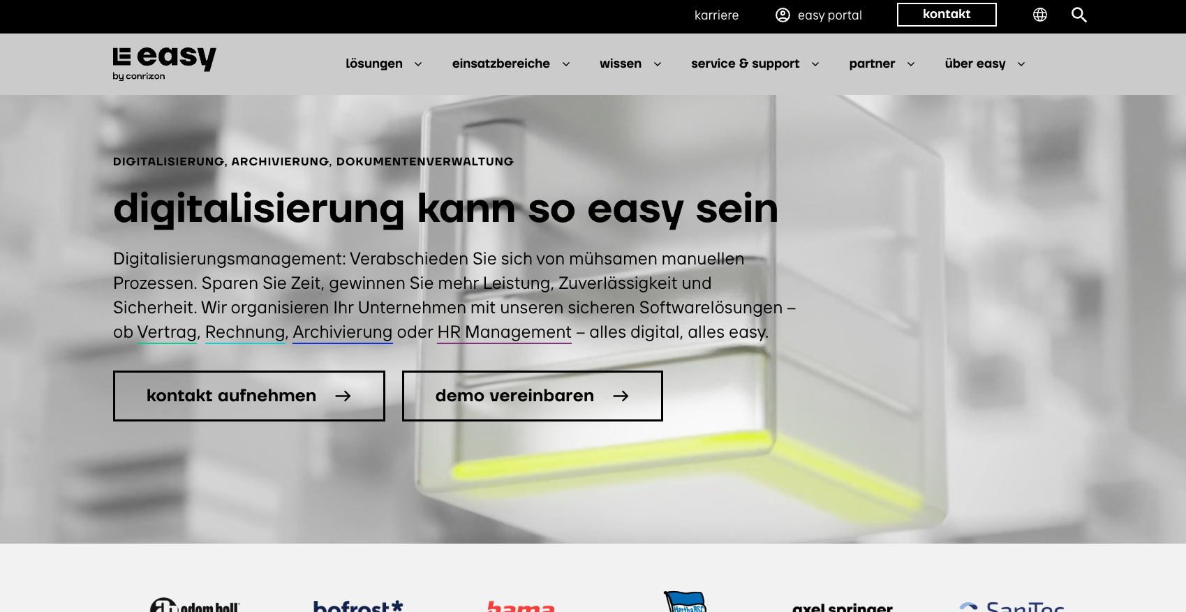 | Easy-Software | Prozessorientierte Suite mit tiefen ERP-Integrationen (insb. SAP), KI-Services für automatisierte Belegerkennung (Posteingang/Rechnungen) und digitales Personal- und Vertragsmanagement |